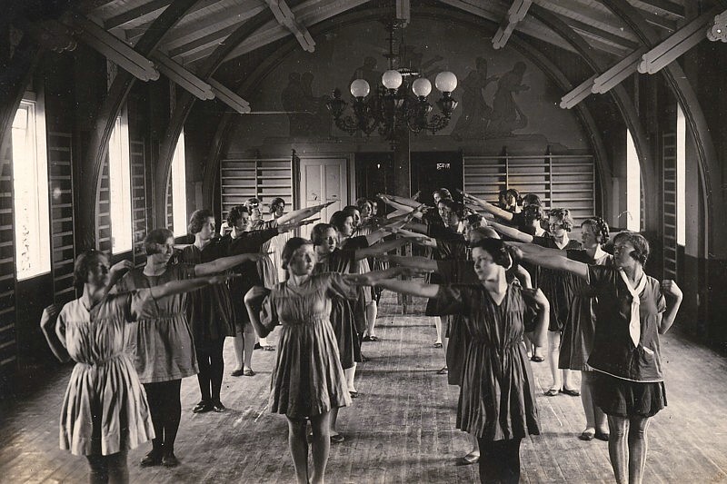 Gymnastilopvisning på sommerholdet 1926. Bemærk lysekronen, som bestod af petroleumslamper. To år senere fik skolen elektrisk lys.