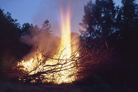 Travetur i Almindingen med forårsholdet 1968 en lørdag eftermiddag i februar. Som det ses, var det ikke uden hindringer efter oktoberstormen året før. Der var mange flere med, men de fleste var kommet over stammerne før jeg fik mulighed for at tage billedet.